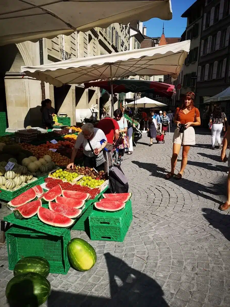 Sabato mattina è giorno di mercato a Losanna. Le strade e le piazzette del centro storico si riempiono di venditori di frutta e verdura, fiorai e produttori agricoli.