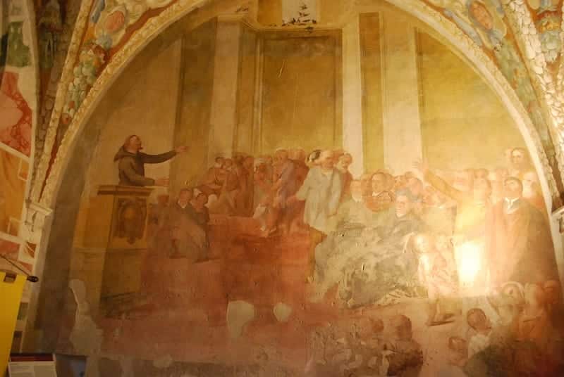 Non ho neanche perso l’occasione di visitare il castello medievale che domina il paese. Costruito nel 995 e poi soggetto a varie ristrutturazioni, nel 1490 il celebrato cavaliere di ventura Bartolomeo d’Alviano ne fece la sua residenza. Bartolomeo, poverino, era venuto al mondo con un parto molto travagliato che costò la vita alla madre. Nel costringerlo tenacemente a condividere con noi questa valle di lacrime, la levatrice dovette afferrarlo con forza, lasciandogli le tracce di un così drammatico ingresso sul volto. Per farla breve, Bartolomeo era proprio brutto. Però sopperiva alle scarse doti fisiche con un ingegno militare fuori dal comune, tanto da renderlo comandante molto richiesto prima dai veneziani e poi dai francesi. Nel suo castello, oltre ad affreschi e armature dell’epoca, è proposta la ricostruzione di una delle sue battaglie più famose, l’unica – ironia del curatore – che abbia mai perso.