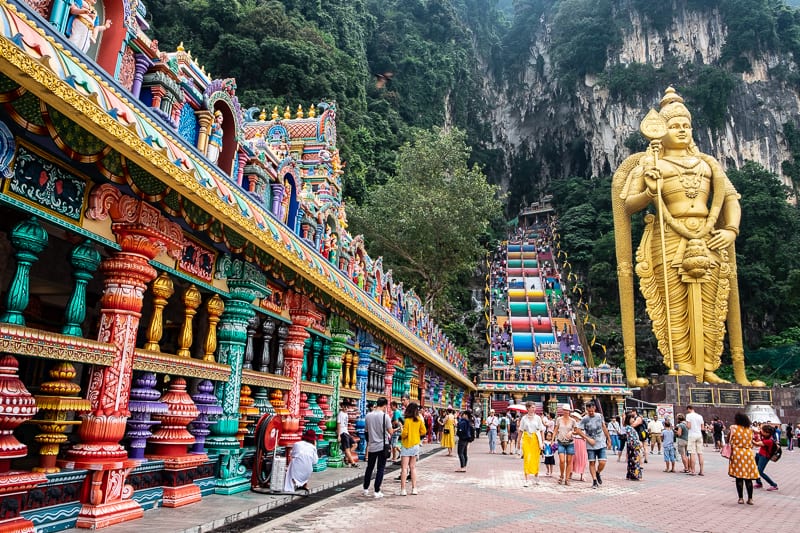 Appena arrivati si rimane colpiti dalla lunga e colorata scalinata (272 scalini che metteranno a dura prova il vostro fiato e le vostre gambe) e dalla grande statua dorata di Karttikeya, il dio della guerra e della vittoria (anche conosciuto come Murugan), che protegge l’ingresso del santuario. Si tratta di una colossale opera alta 42 metri la cui realizzazione, su un terreno molto irregolare, richiese un’incredibile abilità.