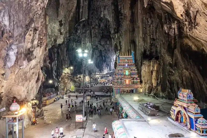 Arrivati in cima, si entra nella prima grotta e si sale su una seconda rampa di scale molto più breve, che conduce a una serie di statue e santuari indu. L’interno delle grotte è illuminato con le luci artificiali ma la luce entra anche da una grande frattura della roccia che permette alla luce naturale di penetrare.