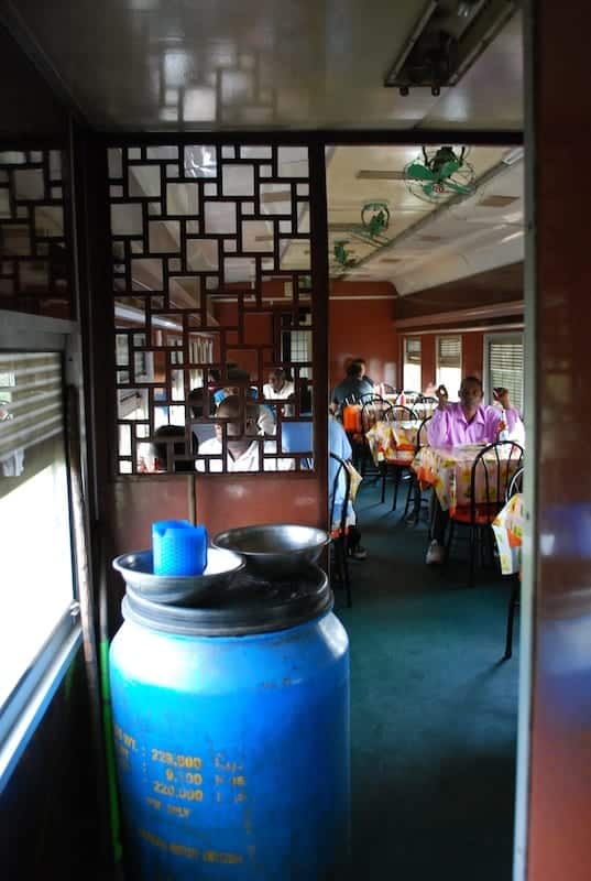 Il vagone ristorante era cosituito da due file di tavoli per quattro persone e non era in alcun modo immune ai continui sbalzi del treno. I camerieri vi sevivano tre pasti al giorno su vassoi che sfidavano questi sbalzi in barba a qualunque legge fisica, un esercizio che a loro riusciva molto meglio di quanto non riuscisse a me consumare tali pasti. Un’altra componente del viaggio che non era esente a tali sbalzi era il pernottamento: rannicchiato sulla mia brandina ho superato la sola notte di viaggio quasi senza dormire, e quando riuscivo a dormire anche l’ambientazione del mio sogno continuava ad andare su e giù animata dagli sbalzi che accompagnavano la mia presenza corporea.