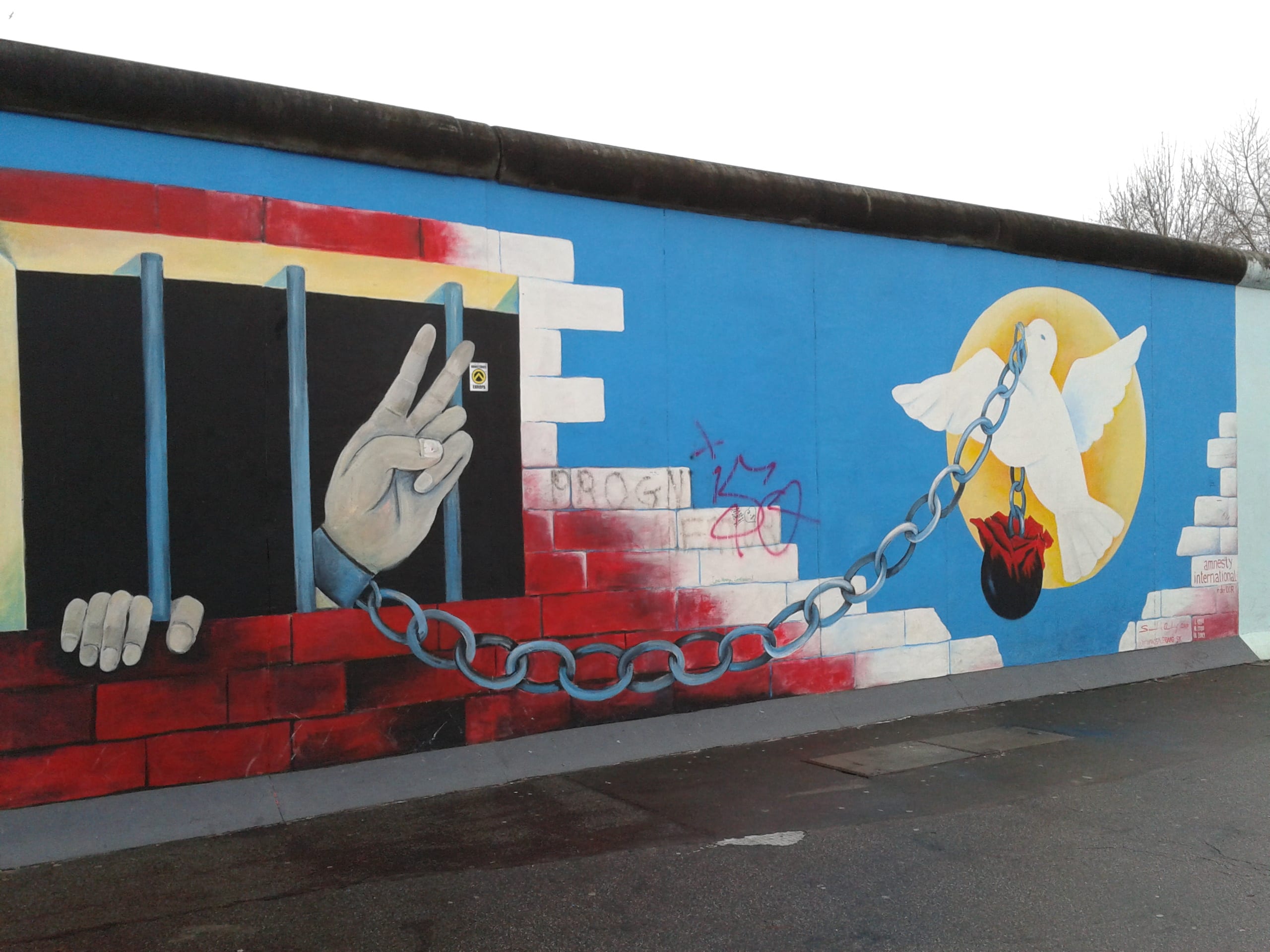 Il terzo giorno a Berlino l’ho dedicato alla visita della East Side Gallery– ossia i resti del Muro – e della parte orientale della città. Camminare sotto il muro che un tempo divideva il mondo è qualcosa di semplicemente indescrivibile. Avevo i brividi, pensando alla storia, al significato, a ciò che quei blocchi di cemento ricoperti di graffiti, disegni e opere d’arte rappresentano e hanno rappresentato. Nelle cuffiette, che coincidenza, comincia a suonare “Another brick in the wall” dei Pink Floyd, creando un’atmosfera surreale.