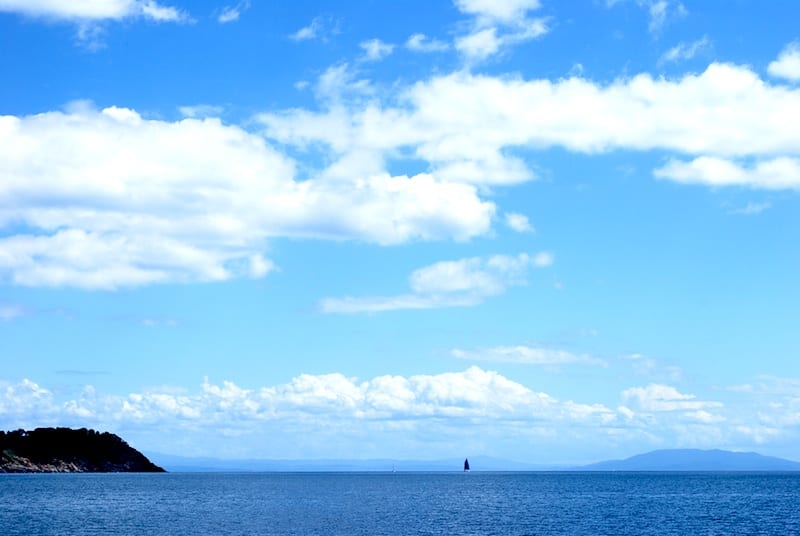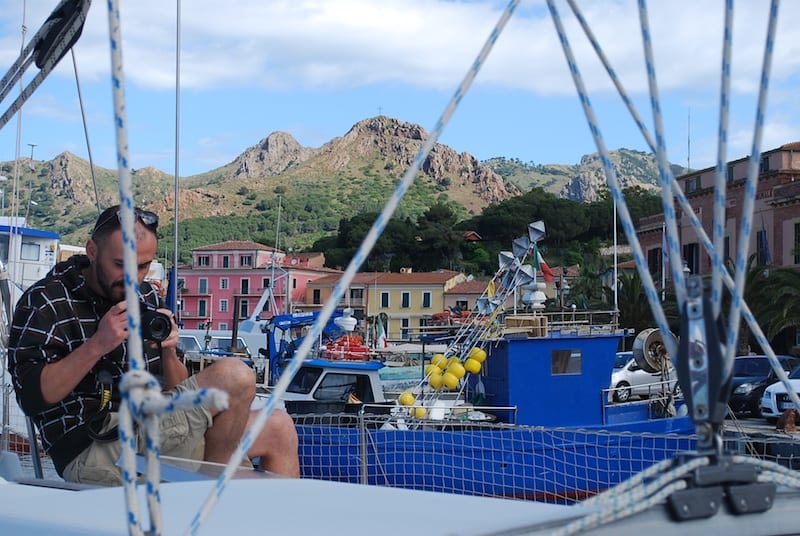Abbiamo poco tempo, ci avvertono, non vedremo molto. Ma a noi, avvelenati dalla città, dall’ufficio e da mille altre miserie quotidiane, ci basta vedere l’azzurro del cielo e il blu del mare per annuire soddisfatti l’un l’altro, perché “sì, la barca è stata proprio la scelta giusta”. Lucio e Simona ci lasciano giocare tra la prua e il timone, osservano pazienti le nostre movenze aggraziate come il passo di un ippopotamo zoppo. Quando abbiamo girato intorno alla nave per una dozzina di volte a testa e abbiamo scattato almeno quattrocento fotografie all’albero, alle vele e alle onde, finalmente ci sediamo un po’ per chiacchierare.