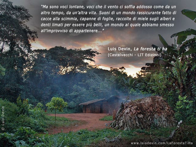 É la foresta. Una presenza avvolgente in cui Luis si è sprofondato per anni nel corso delle sue ricerche antropologiche in Africa centrale. Come altri prima di lui, in fondo. Ma Luis Devin è riuscito a distinguersi da molti suoi colleghi per alcuni tratti professionali molto peculiari. Intanto, oltre che antropologo, è diplomato in Composizione, Musica Corale e Direzione di Coro, e infatti dopo la laurea ha conseguito un dottorato di ricerca in etnomusicologia. Non so bene questo come lo ponga nelle gerarchie del settore, ma in un luogo dove la tua lingua è una cacofonia incomprensibile ai più e la foresta opera un concerto continuo a cui la lontananza dalle tecnologie moderne ti consegna irrimediabilmente, conoscere il linguaggio universale della musica mi pare una risorsa straordinaria, se non per comunicare con l’esterno, almeno per incorniciare la propria esperienza in un quadro sensoriale estremamente completo e sofisticato.