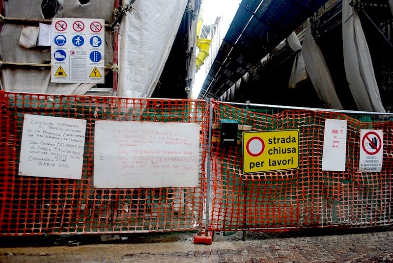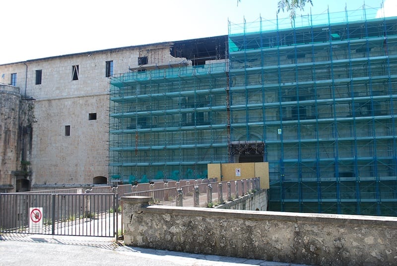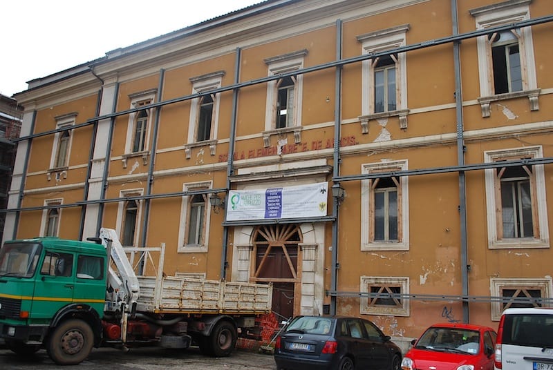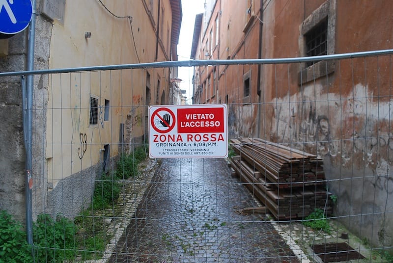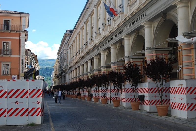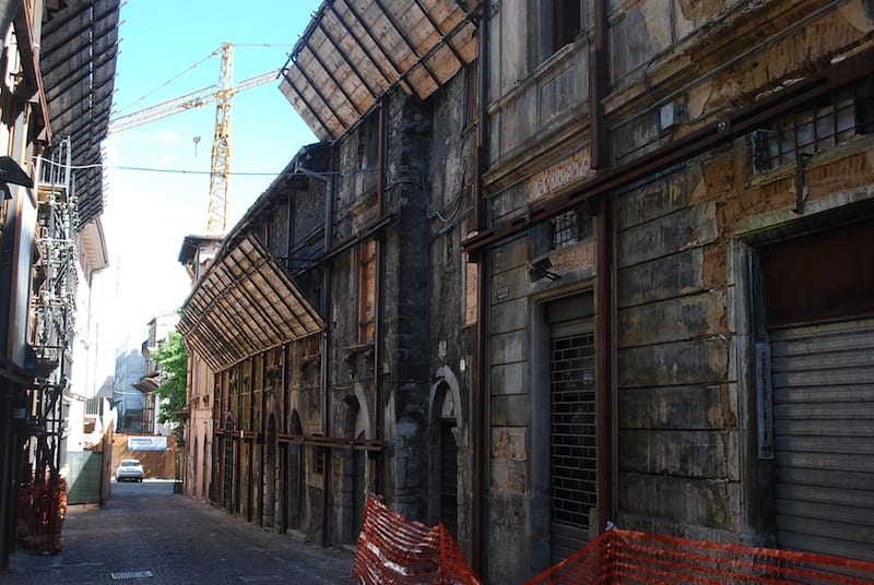 Passeggiando per le strade del centro la sensazione è quella di aggirarsi in un enorme cantiere edile. Arrivando dalla statale si incontrano le prime modificazioni alla viabilità dovute alla ricostruzione del manto stradale, e da lì in avanti ogni angolo è incorniciato da barriere protettive, puntellamenti, scavi e cartelli di pericolo. In Corso Vittorio Emanuele, l’arteria principale della città, quasi non si trova un edificio che non sia sottoposto ai lavori di messa in sicurezza. Dei numerosi negozi che animavano la via solo pochi hanno riaperto, i bar si contano sulla punta della dita e spesso non ospitano altri che qualche muratore.