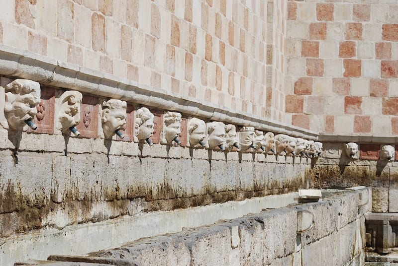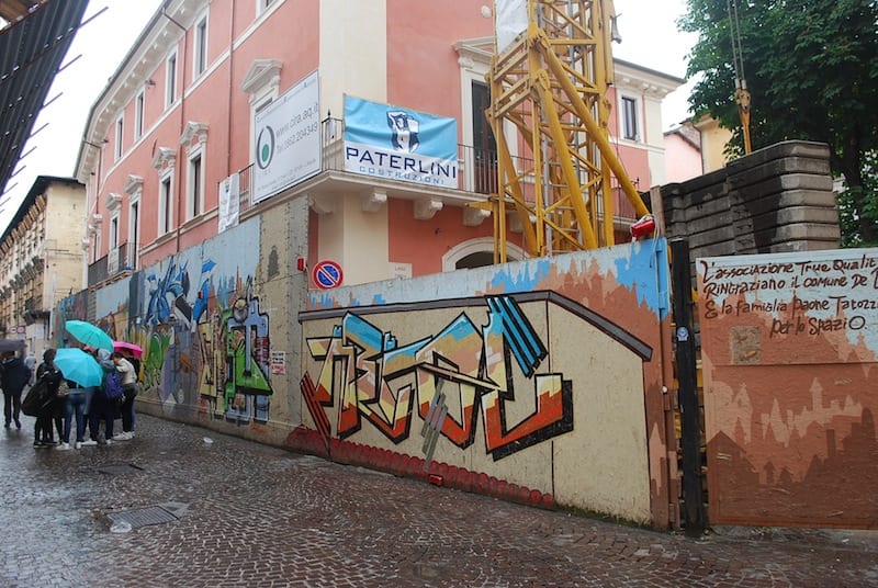 Fontana Luminosa, all’inizio della strada, è molto meno luminosa senza l’acqua che la rendeva viva e molte vie traverse sono chiuse al passaggio perché parte delle famigerate “zone rosse”. In fondo al corso, Piazza Duomo ospita ancora una tenda di soccorso pubblico, mentre le due chiese – la Cattedrale di San Massimo e Chiesa di Santa Maria del Suffragio – sono anch’esse soggette ai lavori di ricostruzione, e sul lato lungo della piazza campeggia uno striscione con la scritta: “Una zona rossa, ovunque si trovi, è una questione nazionale.” La Fontana delle 99 Cannelle, un altro simbolo della città, è stata restaurata, ma al mio arrivo era anch’essa senz’acqua, mentre il Castello dell’Aquila era chiuso ai visitatori per i lavori di ricostruzione.