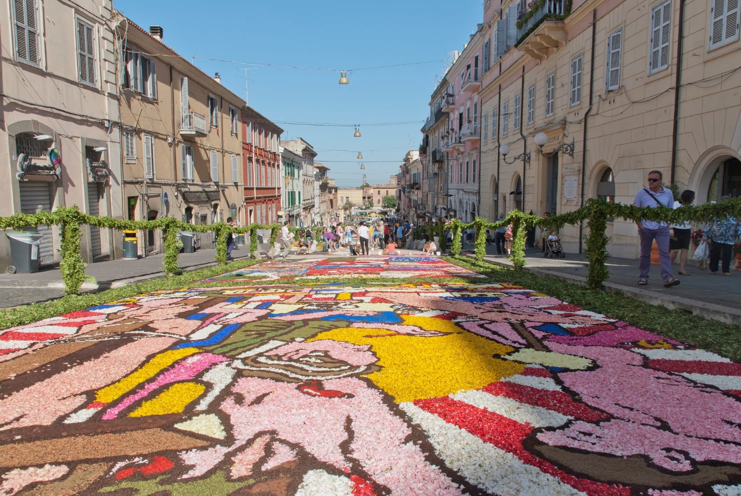 Immaginatevi un borgo caratteristico dei Castelli romani dove le strade sono adornate da milioni di fiori adagiati in terra. Un tappeto colorato che fa da contorno alla celebrazione del Corpus Domini. Ogni singolo petalo viene utilizzato dagli infioratori come fosse una tonalità di colore della tavolozza di un pittore: dal giallo della ginestra all’azzurro della torrena fino al rosso dei garofani. L’evento si conclude con lo “spallamento”, la corsa dei bambini dalla scalinata della Chiesa di Santa Maria per disfare i quadri realizzati.