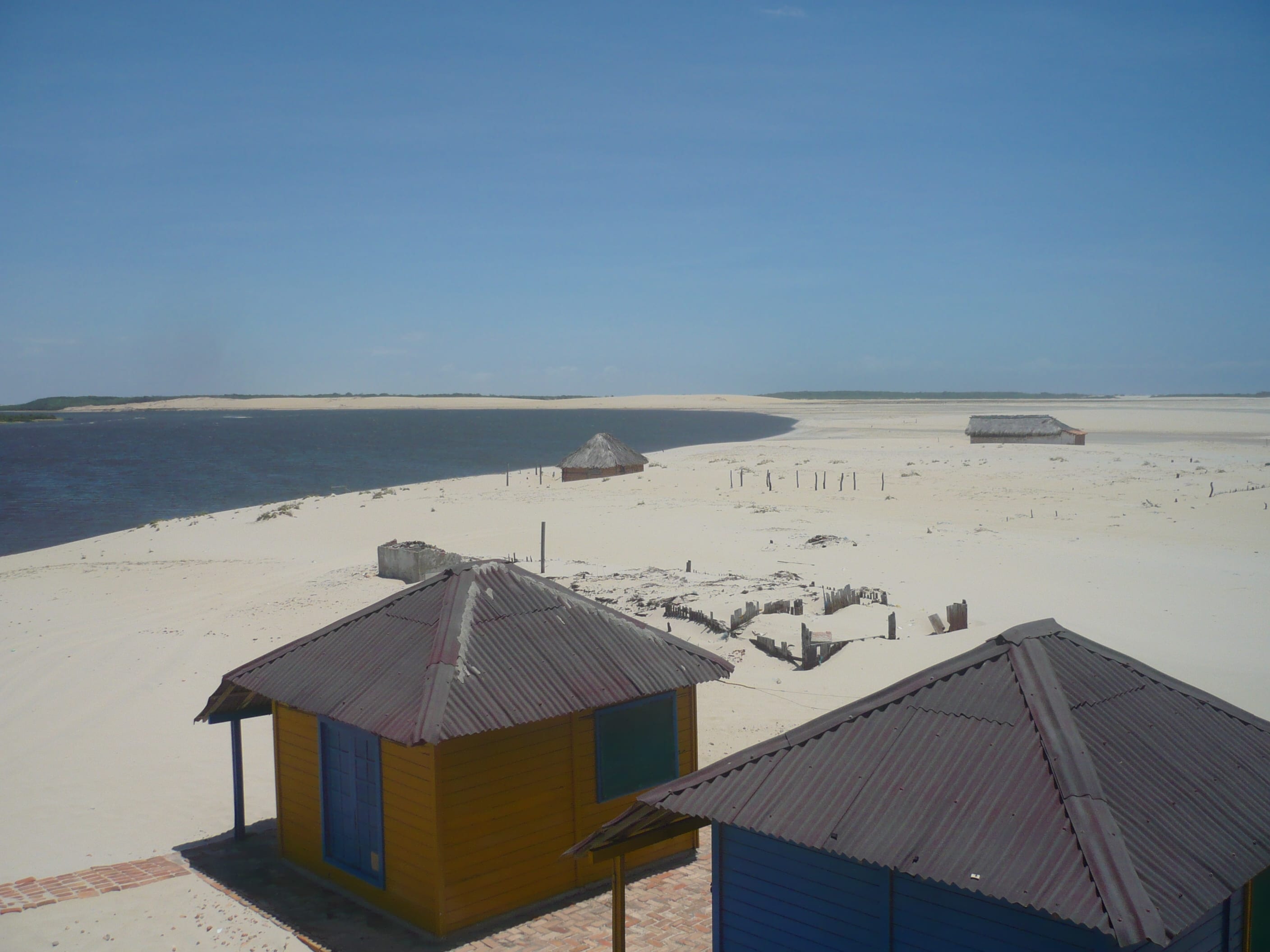 Definirlo un percorso accidentato è sicuramente riduttivo dal momento che passiamo circa due ore aggrappati all’auto. Per fortuna il tragitto è molto interessante. Ci troviamo ad attraversare suggestive borgate ed enormi foreste di piante di cajù (le cajueire). Arrivati a Caburè ci sorprende scoprire che questo paese è composto da tre pousade, un ristorantino e… nient’altro! La sua posizione è magnifica: si trova su una lingua di sabbia tra un fiume d’acqua dolce da una parte, il Rio Preguiças, e l’oceano dall’altra.