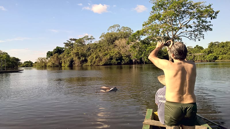 Il motore borbotta tranquillo, ogni tanto Norman per rilassarsi prende un paio di curve a tutta ma quando lo spegne il silenzio è improvviso, è tutto un altro mondo, una scimmia scoiattolo tra le frasche della riva ci guarda sorpresa mentre scivoliamo sull’acqua, una famiglia di scimmie urlatrici si muove in alto su un albero – sono una specie diversa da quelle del Madidi – ci spiega Norman – sono marroni e non rosse – uno, dos, tres, sbuff! Eccoli attorno alla barca nello slargo prima del lodge – se volete domani facciamo il bagno coi delfini – certo che vogliamo.