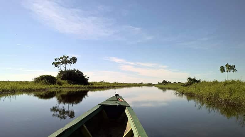 Luce splendida del mattino, cappelli di paglia in testa, i soliti uccelli che becchettano sul prato del capibara, niente caimani, una garzetta bianca danza sull’acqua nera, borbottando piano piano ci inoltriamo in una pianura di acqua e canne, silhouette di palme lontane.