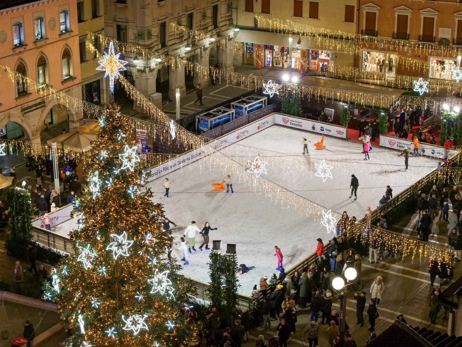 Con l’iniziativa “Venezia. It’s Christmas Time”, il centro della città assume un aspetto davvero magico e accogliente. L’atmosfera natalizia è particolarmente suggestiva grazie a un’illuminazione curata nei minimi dettagli. Al centro della piazza si trova il bellissimo albero di Natale, ben decorato: migliaia di luci LED (a basso consumo) lo circondano e decorano anche l’intera piazza.