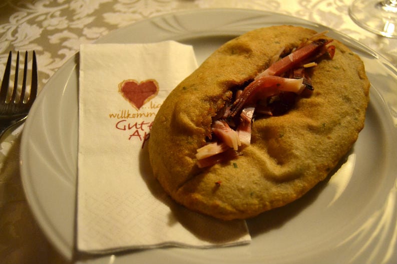 Rientriamo poi in albergo e ci riposiamo un pochino prima della cena al Bad Rungg, hotel dal sapore “vintage”, dove mangeremo piatti tipici della tradizione sarentinese fra cui gli Striezl: panini fritti di pasta lievitata fatta con farina di segale ed erba cipollina, con un taglio al centro che accoglie vari ripieni… nel nostro caso si tratta di speck tagliato a listarelle (il miglior modo per gustare appieno il suo sapore). Gli Striezl possono essere gustati anche con il brodo di carne, con le patate o con tutto ciò che la fantasia può suggerire.