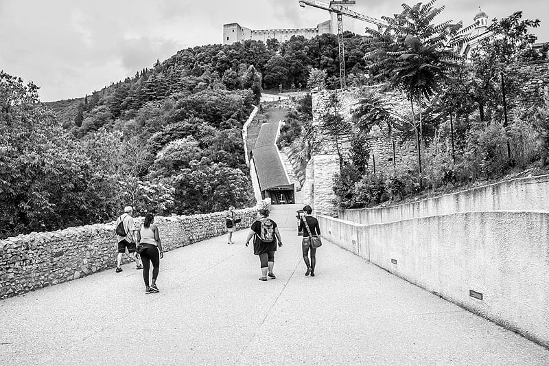 Ripartendo da Villa Redenta per tornare verso la città alta potrebbe preoccuparvi tutta la salita da fare. Mai paura! Spoleto dal punto di vista della mobilità è sorprendente. Dal lato della città sotto la Rocca ci sono una serie di scale mobili che vi faranno affrontare senza fatica la salita fino alla zona alta di Spoleto. Durante il Festival dei 2Mondi di Spoleto, le scale sono in funzione fino alle due di notte e vi porteranno proprio fino al punto più alto della città. Da lì sarà sufficiente seguire le bellissime vie del centro, tra bottegai e norcini, non dimenticando mai di lasciare che il nostro sguardo da viaggiatori si perda nella bellezza di un luogo pieno di storia e arte come Spoleto.
