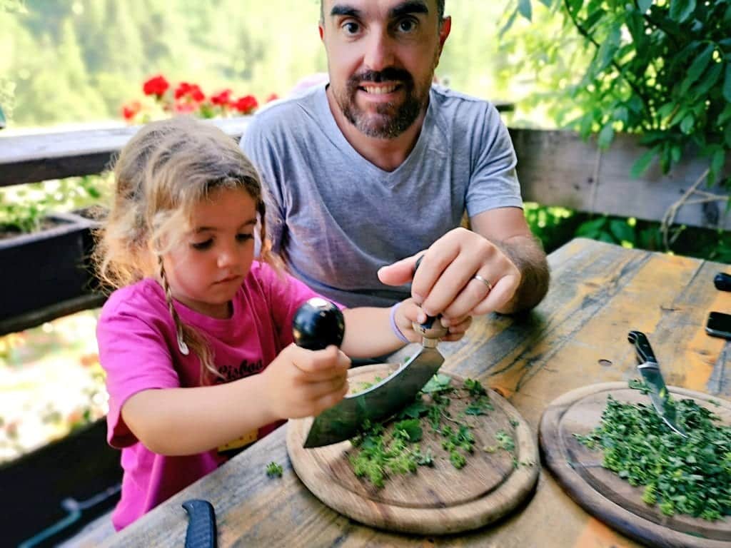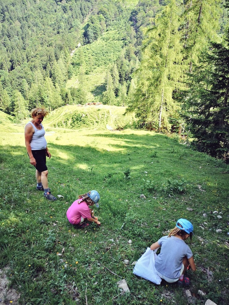 La signora Martieschek (proprietaria della malga) ha organizzato per la nostra famiglia un’escursione a piedi attorno alla malga per raccogliere delle erbe che poi abbiamo usato per fare del pesto.