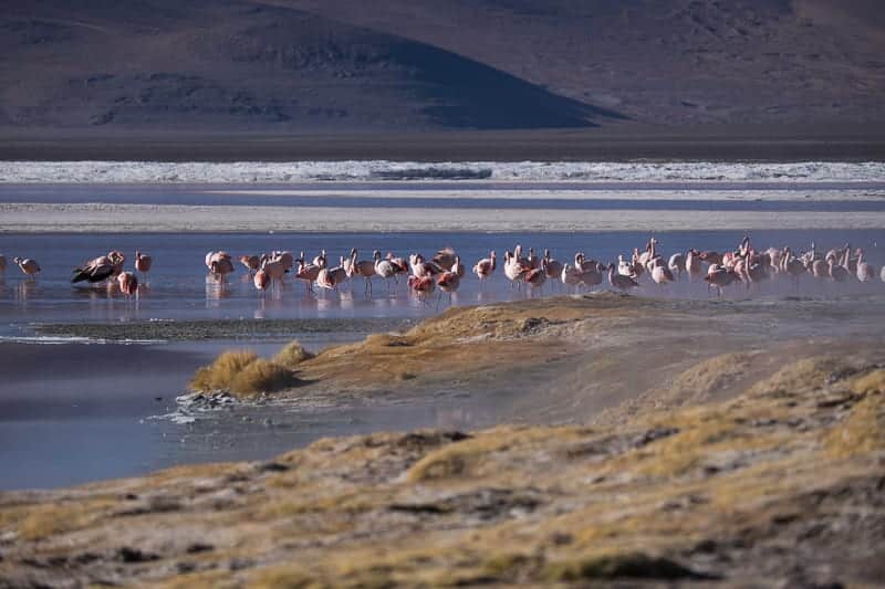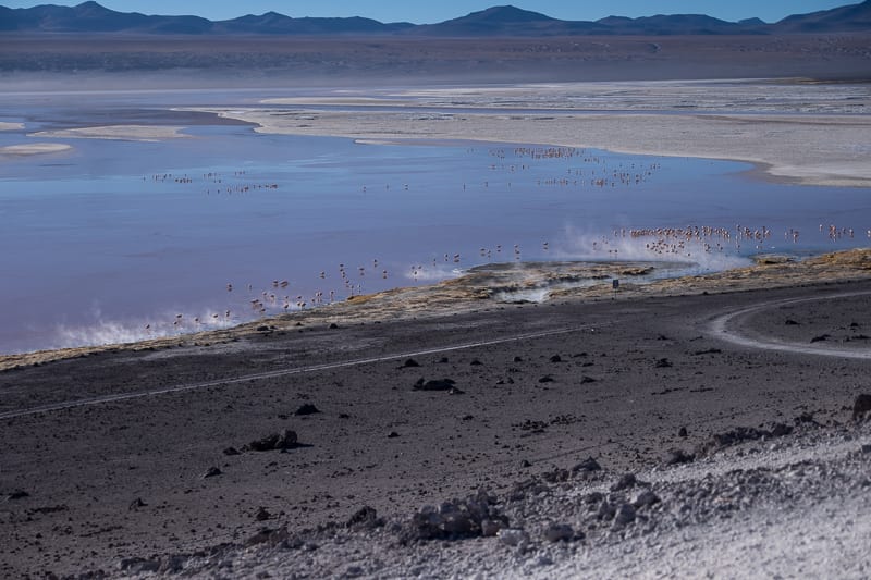 Il secondo giorno sveglia all’alba un po’ traumatica viste le temperature molto rigide. Ci siamo però riusciti a scaldare subito con la visione magnetica della Laguna Colorada che si estende per ben 60 kmq e non raggiunge mai una profondità superiore agli 80cm.