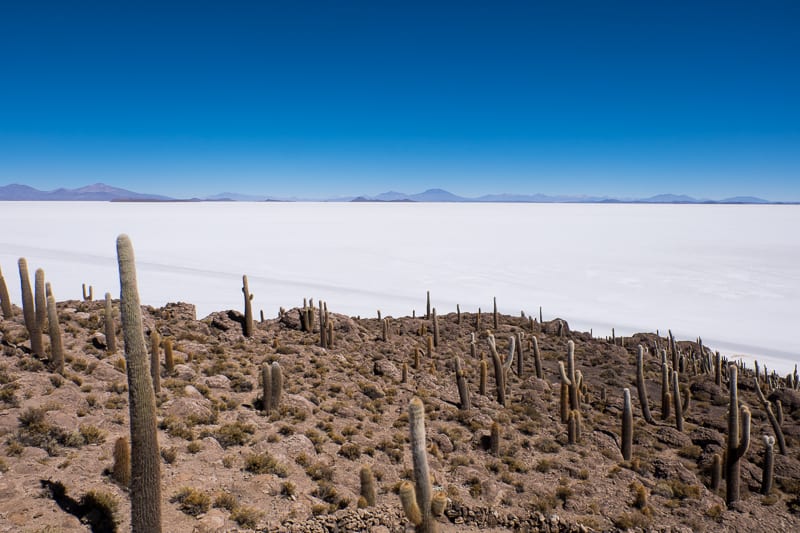 L’occhio, per sua natura, scruta l’orizzonte per trovare altri elementi rendendo però vano ogni tentativo. Trova sollievo solo nel momento in cui si raggiunge la nota Isla Incahuasi, situata proprio nel cuore del Salar. La Isla altro non è che una collina di roccia ricoperta di cactus che si può percorrere attraverso i suoi tortuosi sentieri. Questo luogo è ormai diventato molto turistico e, per lo più, frequentato nell’ora di pranzo. Io consiglierei di visitarla in un altro orario proprio per evitare le orde di turisti che tolgono un po’ di magia a questo posto tanto affascinante.