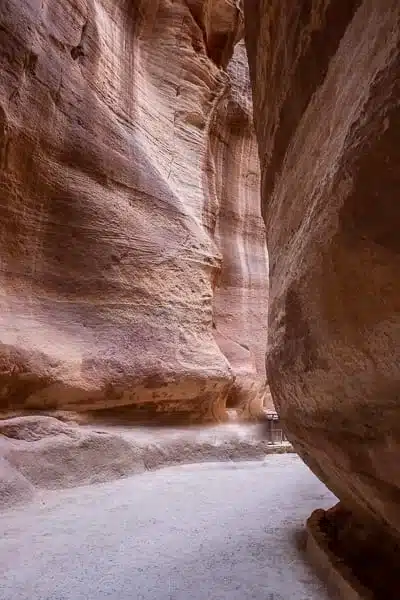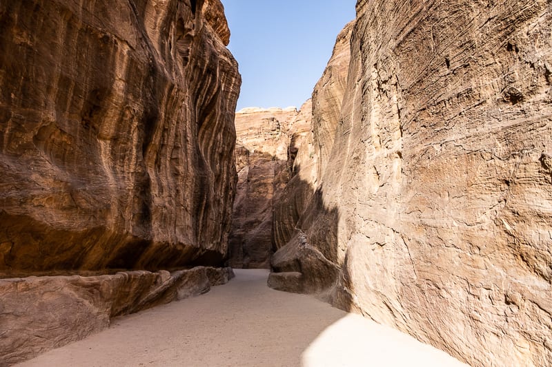 Si raggiunge il cuore del sito attraverso un sentiero lungo 1,2 chilometri stretto tra altissime pareti rocciose, il Siq. Le pareti che costeggiano il Siq arrivano sino a 200 metri. Non si tratta tuttavia di un canyon ma una di una faglia geologica prodotta da forze tettoniche. La prima cosa che è opportuno notare è la rete di canali scavati nella roccia utili a portare l’acqua a Petra.