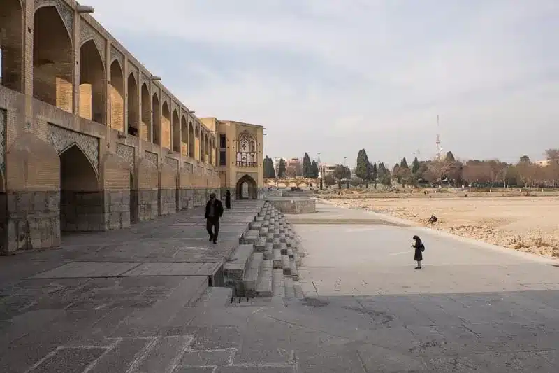C’è però un grosso un piccolo particolare da sottolineare, ovvero che questi ponti attraversano ormai un corso d’acqua inesistente. Da qualche anno ormai l’acqua dello Zayandeh è ridotta a un rigagnolo, d’inverno, per poi scomparire ai primi caldi quando le dighe a monte vengono chiuse e la poca acqua disponibile deviata verso i distretti agricoli.
