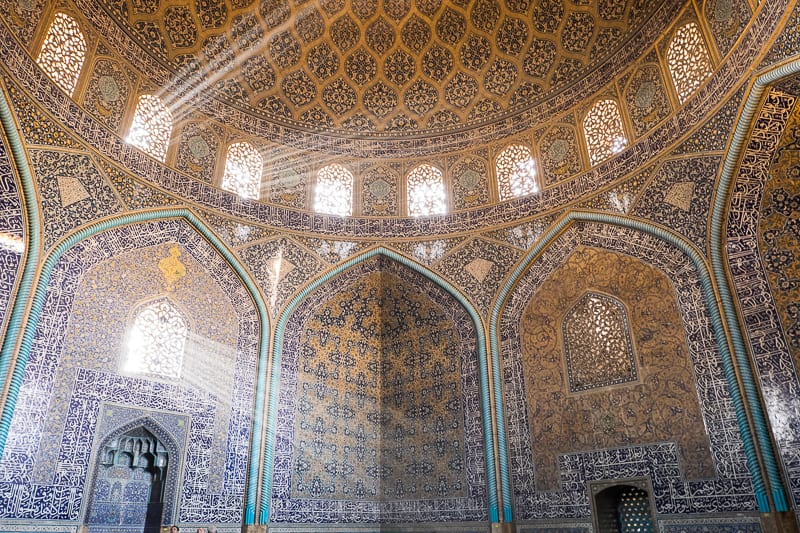 La conclusione perfetta di questa giornata è stata la visita della moschea Masjed-e Sheikh Lotfollah, alla quale si accede sempre dalla piazza principale. La cupola di questa moschea è di straordinaria bellezza, la quale, per altro, viene esaltata all’ora del tramonto per via dell’effetto che la luce crea sulle piastrelle di maiolica dalle tinte tenui in contrasto con quelle azzurre della cupola. Qui suggerisco di entrare e di sedersi naso all’insù osservando in silenzio questo straordinario capolavoro architettonico.