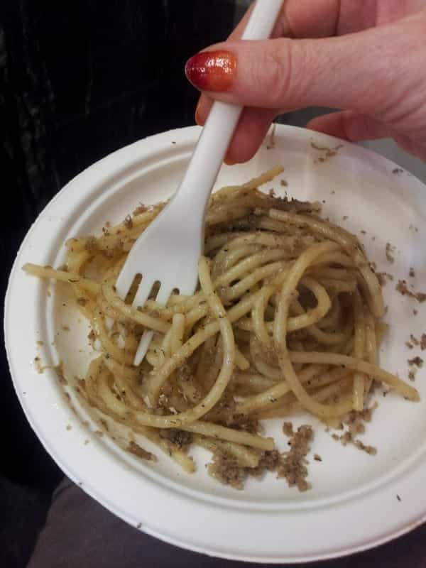 Aurelio Damiani con i suoi Spaghetti Mancini alici e tartufo estivo dei Sibillini è riuscito a farmi innamorare di un piatto che di mia spontanea volontà non avrei mai scelto in quanto a parte gli spaghetti, non amo nessun altro degli ingredienti. L’estrema semplicità abbinata alla grande qualità delle materie prime e alla sapienza dello chef, hanno creato un piatto sorprendente e davvero ottimo! Lo accompagna molto bene un Offida Passerina.