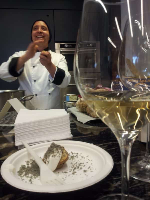 La nostra sessione di show cooking si è aperta con lo chef Daniele Maurizi Citeroni che ha presentato un piatto dal sapore antico e semplice: Galantina e giardiniera con due maionesi vegetali abbinato ad un ottimo Falerio. Ho particolarmente apprezzato la leggerezza delle due maionesi vegetali, rispettivamente di cipolla e di asparagi con una base di patate.